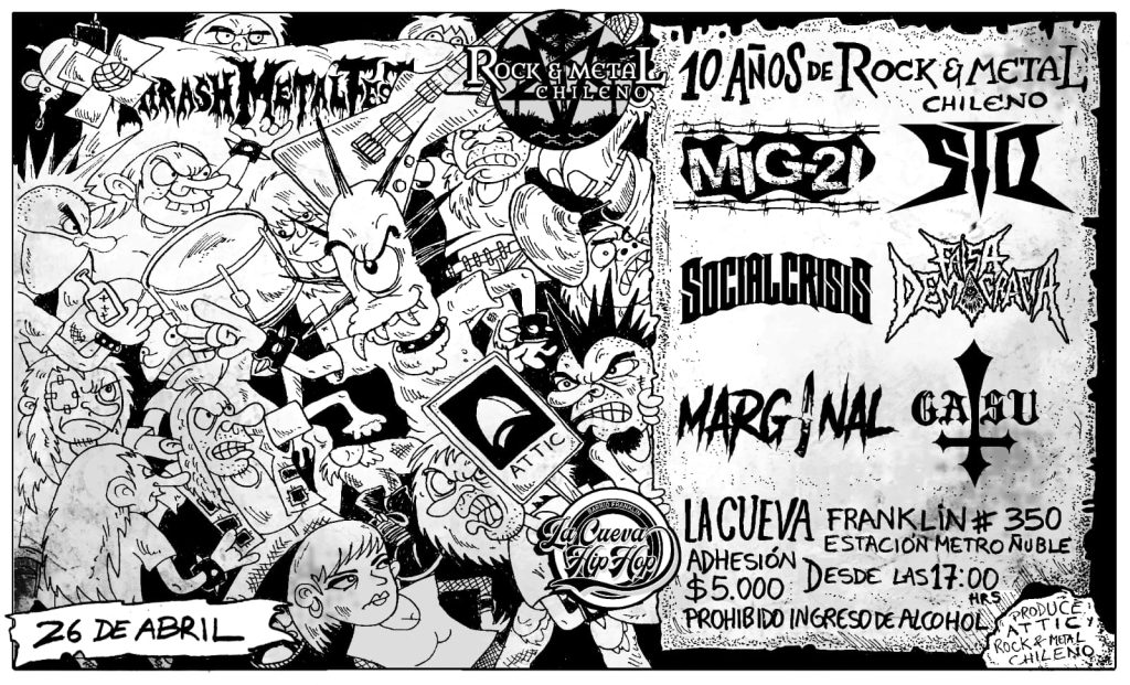 Este sabado 26 abril tenemos el agrado de colaborar con el decimo aniversario de ROCK&METAL CHILENO en la CUEVA DE FRANKLIN junto a las bandas MIG-21, SIO, SOCIAL CRISIS, FALSA DEMOCRACIA, GASU y MARGINAL desde las 17hrs. Direccion franklin 350, al sur de matta. Colabora www.todorock.cl.