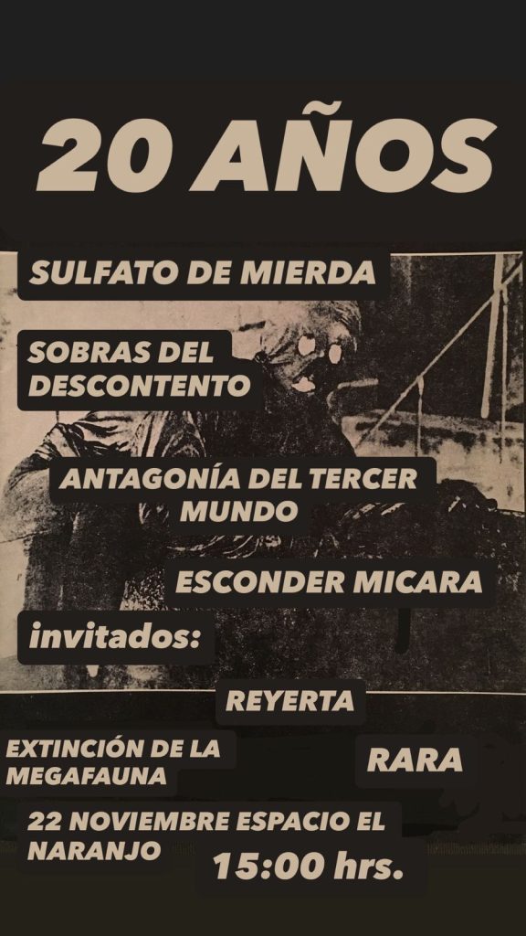20 años sulfato de mierda junto a sobras del descontento, antagonia del tercer mundo, esconder mi cara, reyerta, rara + exctincion de la megafauna en vivo espacio naranjo sabado 22 noviembre. Metro rondizzoni.Colabora www.todorock.cl