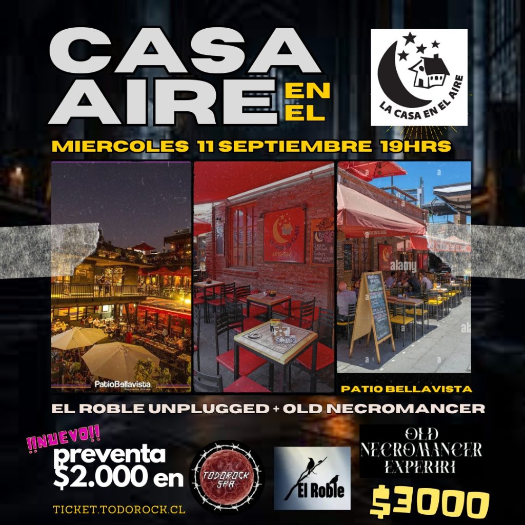 Este miércoles 11 septiembre estaremos en la casa en el aire de patio bellavista desde las 19:00 hrs junto a el Roble (unplugged) y Old Necromancer. Puerta $3.000. Preventa $2.000 en ticket.todorock.cl invita www.todorock.cl