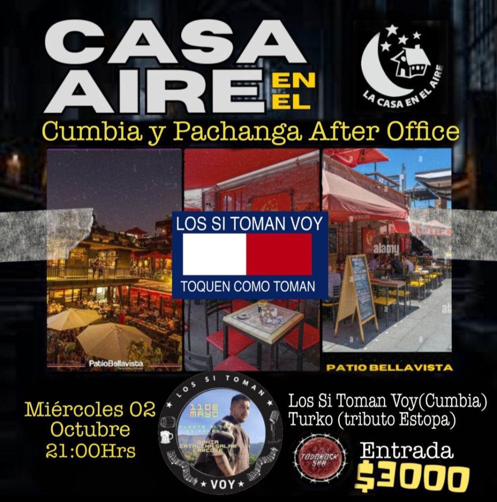 Partio Octubre con la mejor cumbia en la consolidad CASA EN EL AIRE ubicada en el patio Bellavista de Providencia junto a LOS SI TOMAN VOY(cumbia) + TURKO( TRIBUTO ESTOPA) este Miércoles 2 Octubre 21hrs. En un calido, grato y seguro ambiente internacional. Colabora www.todorock.cl y casa en el aire.