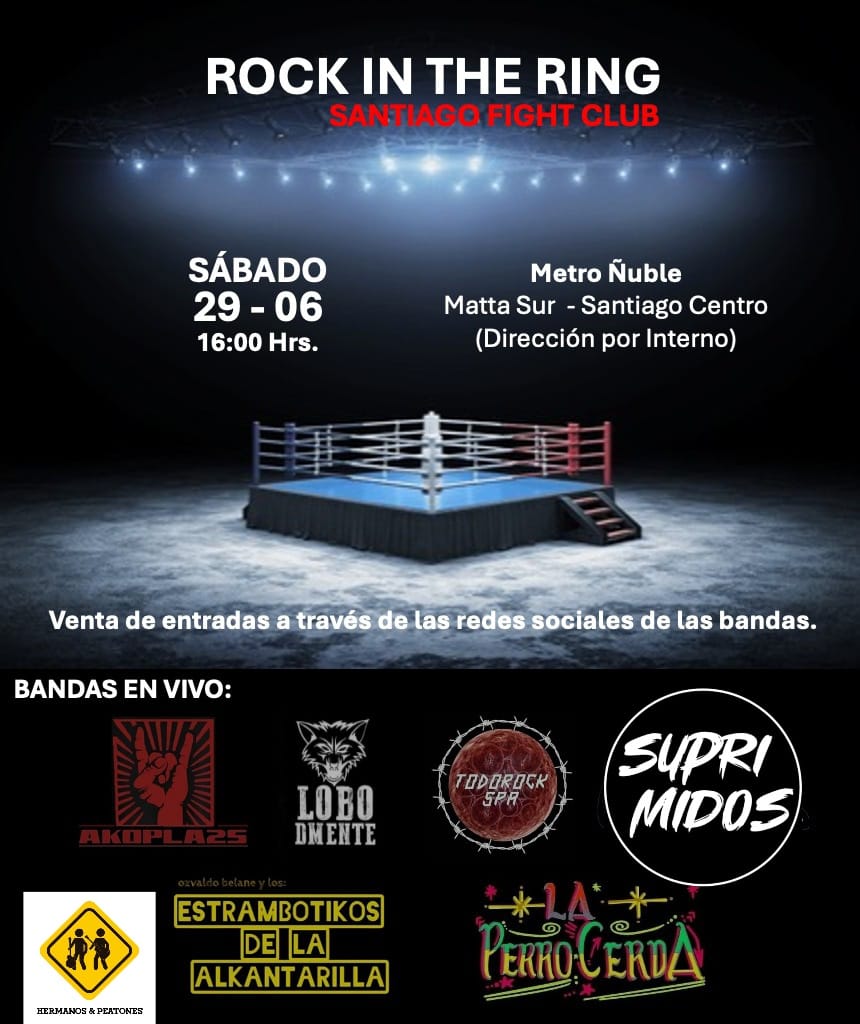 Este sabado 29 junio continuan las tocatas en el santiago fight club de marta sur, metro ñuble desde las 15hrs junto a TRIBUTO A DEEP PURPLE(akopla2) + LOBO DMENTE, LA PERRO CERDA, HERMANOS&PEATONES, SUPRIMODOS + OSVALDO BELANE&LOS ESTERAMBOTICOS DE LA ALKANTARILLA. Ciclo rock in the ring con bandas en vivo arriba del cuadrilatero!!! Invita www.todorock.cl y santiago fight club.
