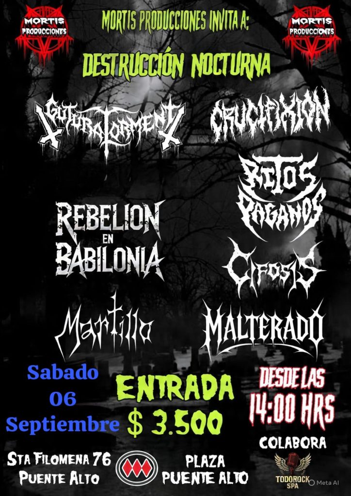 Sabado 6 septiembre ciclo mortiz producciones puente alto festival DESTRUCCION NOCTURNA desde las 14 hrs junto a GUTURRAL TORMENT, CRUCIFIXION, RITOS PAGANOS, LA REBELION DE BABILONIA, MARTILLO, MALTERADO y CIFOSIS. COLABORA WWW.TODOROCK.CL. acceso $3500.