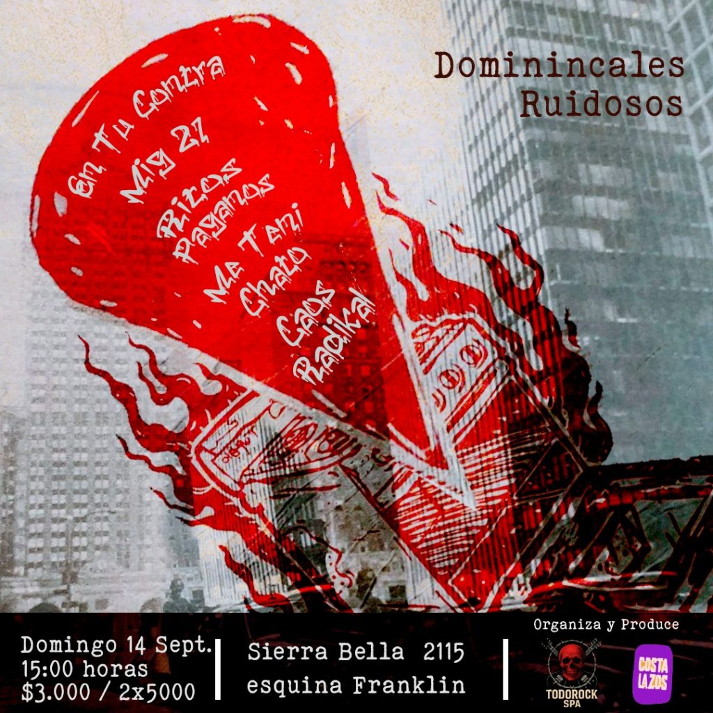 Tocatas dominicales bandas en vivo domingo 14 septiembre junto a EN TU CONTRA, MIG 21, RITOS PAGANOS, MTC y CAOS RADICAL desde las 15hrs en club camce SIERRA BELLA 2115, esquina franklin. Www.todorock.cl y costa lazos producciones.