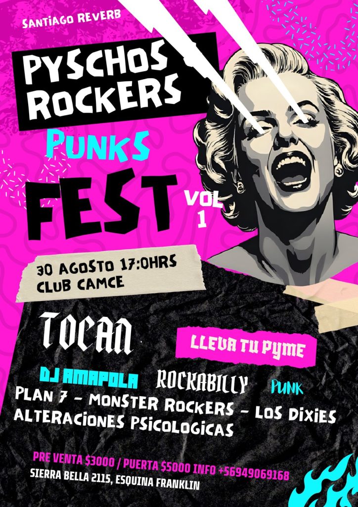 Sabado 30 agosto club camce santiago reverb y www.todorock.cl presentan psycho rocker punks fest junto a PLAN 7, MONSTER ROCKERS, LOS DIXIES y ALTERACIONES PSICOLOGICAS desde las 17hrs. En SIERRA BELLA 2115 ESQUINA FRANKLIN. Valor $5.000 preventa $3.000.