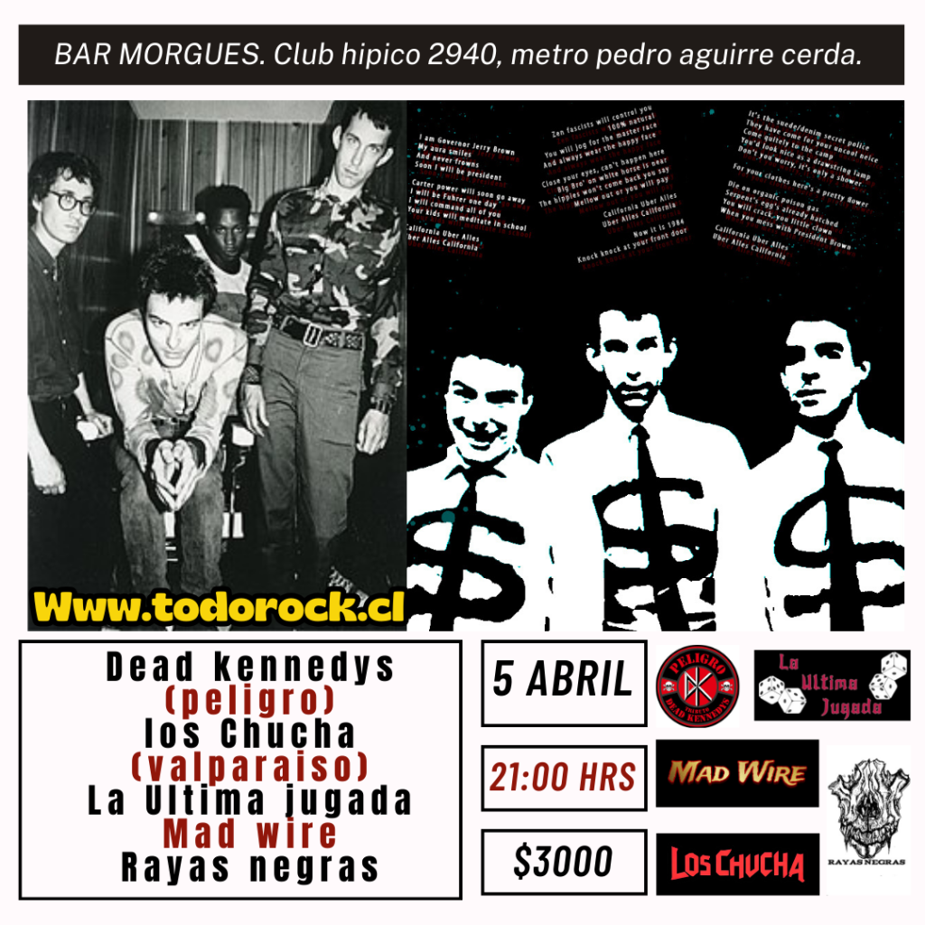 Este sabado 5 abril estaremos iniciando un ciclo en el morgues bar de la COMUNA P.A.C. junto a las bandas TRIBUTO DEAD KENNEDYS(PEÑIGRO), LA ULTIMA LLAMADA, LOS CHUCHA(desde Valparaíso), MAD WIRE y RAYAS NEGRAS. INICIO 21HRS, DIRECCIÓN club hipico 2940, metro pedro aguirre cerda. Adhesion puerta $3.000 invita. Produce y colabora www.todorock.cl