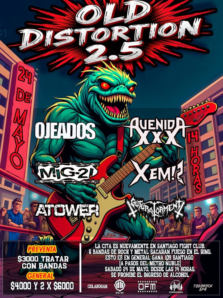 Nuevamente tenemos el agrado de colaborar con otra VERSIÓN del festival OLD DISTORTION en el cuadrilatero del santiago fight club este sabado 24 mayo desde las 14hrs en general gana 109. Bandas en vivo: MIG-21, OJEADOS, AVENIDA XXX, GEMI2, ATOWER y GUTURRAL TORMENT. Adhesion $4.000. Colabora www.todorock.cl