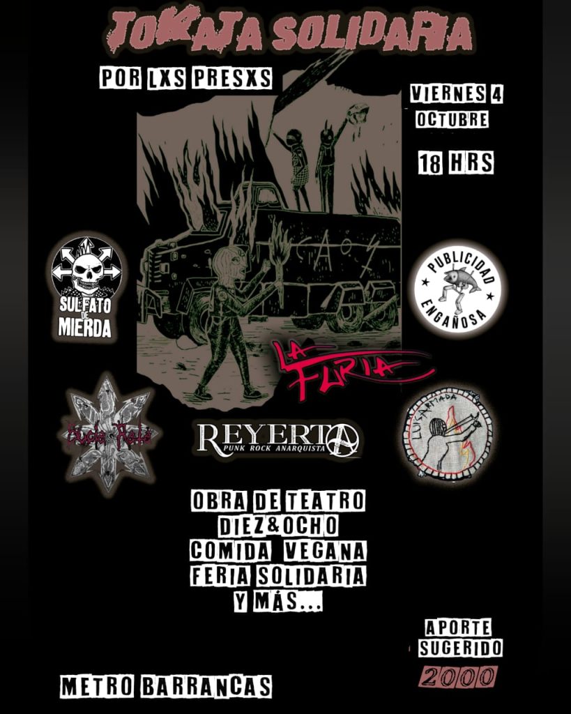 Estamos de regreso al aire libre en los alrededores del metro barrancas para colaborar con esta jornada solidaria desde las 18hrs junto a las bandas REYERTA, SULFATO DE MIERTA, PUBLICIDAD ENGAÑOSA, LA FURIA, SUCIA RATA Y LUISARMADA. Aporte voluntario $2.000. Colabora con refuetzo y bkl www.todorock.cl