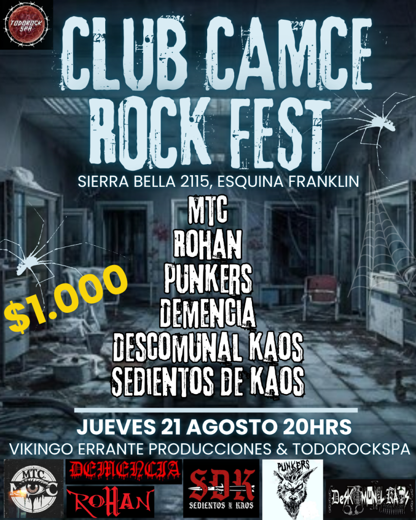 Este Jueves 21 agosto desde las 20hrs estaremos junto a vikingo errante producciones en pleno ciclo #todorockspa camce club de SIERRA BELLA 2115, ESQUINA FRANKLIN( al sur de matta) con las bandas ME TENI CHATO, ROHAN, PUNKERS, DEMENCIA, DESKOMUNAL KAOS y SEDIENTOS DE KAOS. adhesion $1.000. Invita vikingo errante producciones y www.todorock.cl