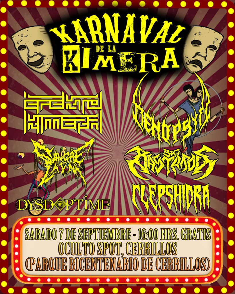 Saturday 7 sept. En el okulto skate park (squat skate park) en la comuna de cerillos se desarollara el KARNAVAL DE LA KIMERA desde las 16hrs con 6 bandas metal originales en vivo. Colabora www.todorock.cl. primavera 2024!!!!