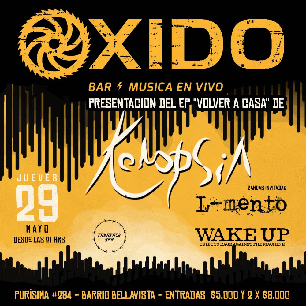 Jueves 29 mayo en bar oxido purisima 282 desde las 21hrs junto TRIBUTO RAGE AGAINST THE MACHINE(WAKE UP), L-MENTO y KENOPSIA. Colabora www.todorock.cl
