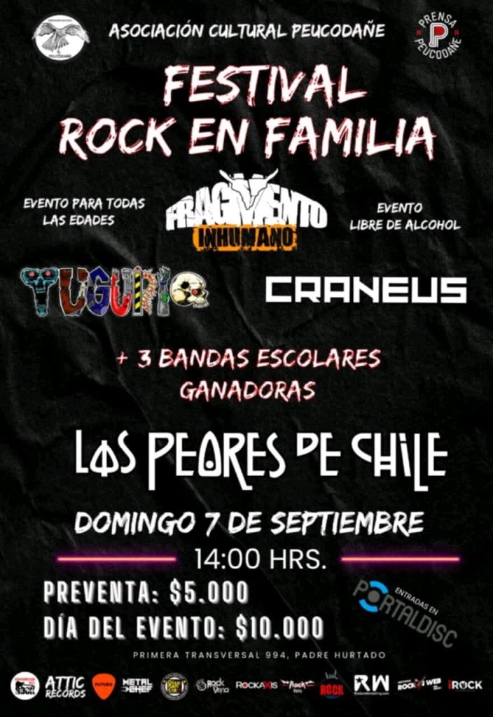 Chilenos todos !!! Asociacion cultural Peucodañe te invita a “ROCK EN FAMILIA” este 7 de septiembre en Padre Hurtado, bandas de colegios, bandas independientes y los ya consagrados “LOS PEORES DE CHILE” estaran en esta gran fiesta familiar, habra juegos, comida, emprendedores, cervezas sin alcohol ( evento libre de alcohol) para que toda la familia comparta junto a nosotros una tarde completa de musica, juegos y rocanroll !!! Los esperamos en primera trasnversal 994, padre hurtado, entradas por portaldisc. Aforo controlado. Colabora www.todorock.cl