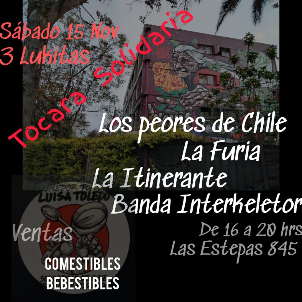 Jornada solidaria comedor luisa toledo, villa francia junto a LOS PEORES DE CHILE, LA FURIA, LA ITINERANTE y BANDA INTERKELETOR. sabado 15 noviembre 16hrs. $3.000. Colabora www.todorock.cl