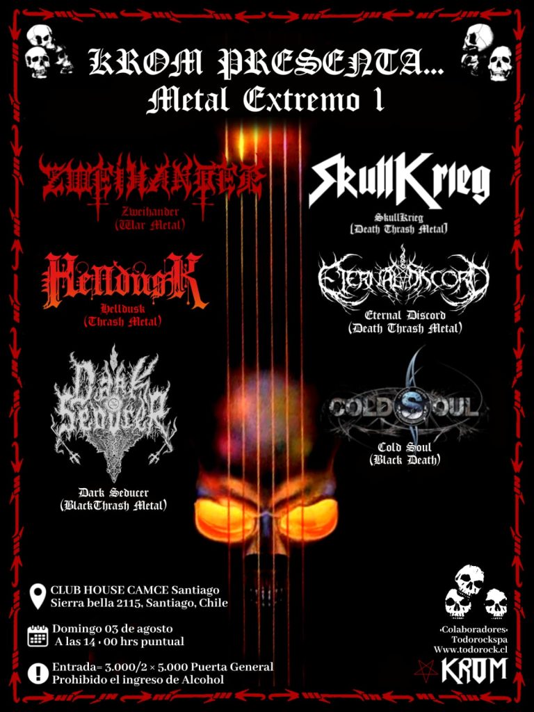 Domingo 3 agosto debut festival de metal extremo a cargo de KROM PRODUCCIONES y con la colaboración de www.todorock.cl desde las 14hrs. En CLUB CAMCE , sierra bella 2115.