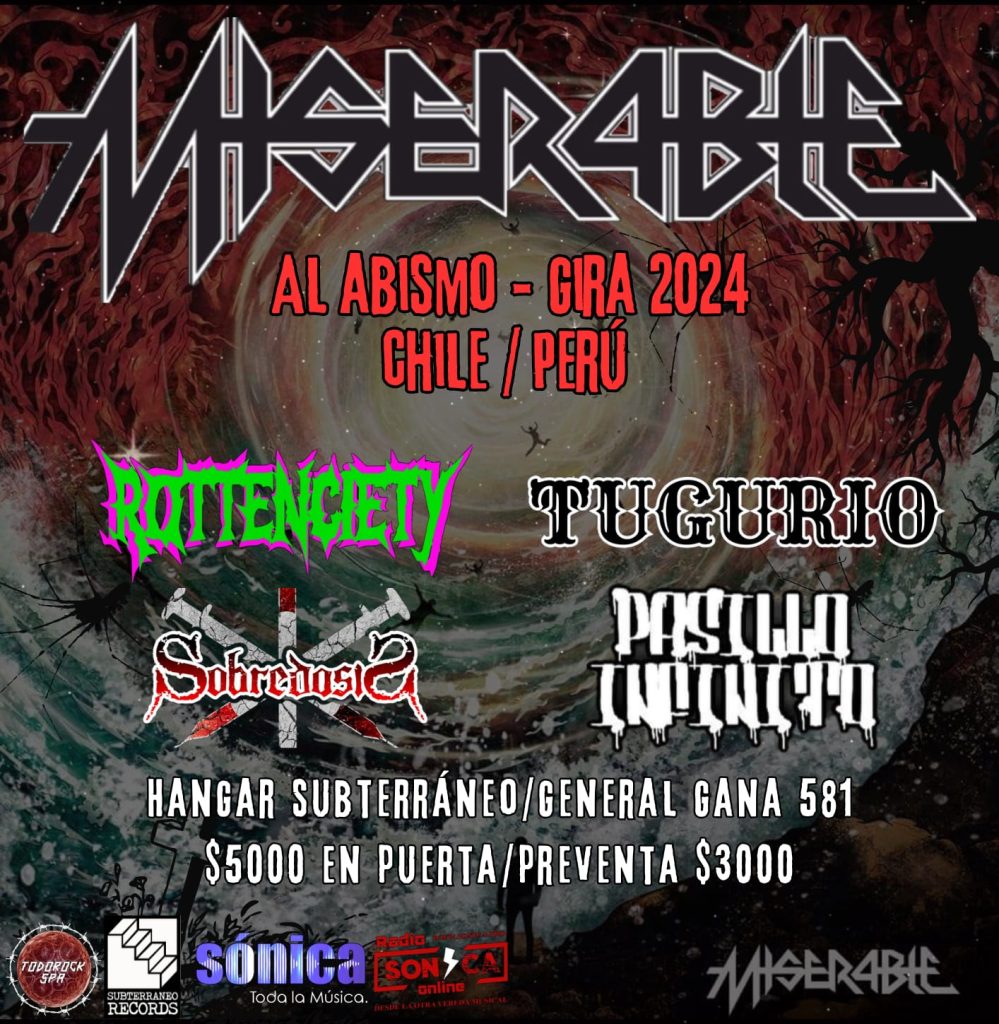 Este jueves 19 diciembre tenemos el honor de recibir a la banda Peruana MISERABLE quien esta de paso por Chile en marco de su gira AL ABISMO 2024. El lugar decdicho encuentro sera el consolidado HANGAR SUBTERRANEO de General Gana 581, esquina San Isidro desde las 20hrs junto a los nacionales TUGURIO, SOBREDOSIS, ROTTENSIETY y PASILLO INFINITO. ADHESION PUERTA $5.000. PREVENTA $3.000 SOLO EN TICKET.TODOROCK.CL INVITA WWW.TODOROCK.CL, HANGAR SUBTERRÁNEO Y RADIO SONICA.