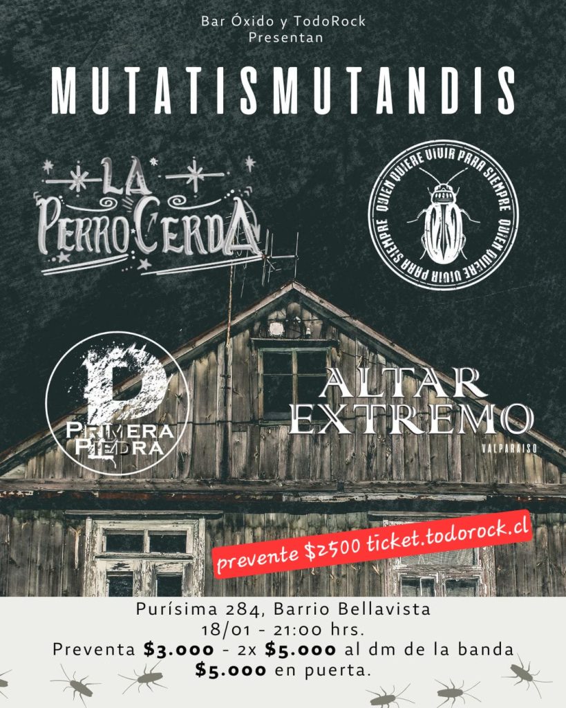 En viVo se presentan QUIEN QUIERE VIVIR PARA SIEMPRE, LA PERROCERDA, ALTER EXTREMO(DESDE VALPARAISO) y PRIMERA PIEDRA este sabado 18 enero desde las 21hrs en bar oxido, purisima 282, recoleta. Invita www.todorock.cl