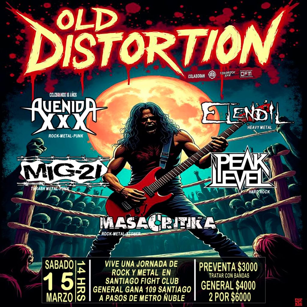 Este sabado 15 marzo volvemos al Santiago fight club con el festival OLD DISTORTION arriba del cuadrilatero junto a las bandas AVENIDA XXX, MIG-21, ELENDIL, MASA CRITICA y PEAK LEVEL desde las 14hrs. General gana 109, metro ñuble. Colabora www.todorock.cl