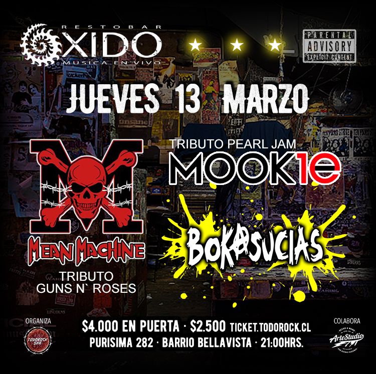 Estd jueves 13 marzo en el bar oxido de purisima 282, recoleta, se presentan las bandas MOOKIE PEARL JAM, MEAN MACHINE GUNS N ROSES Y BOKASUCIAS desde las 21hrs. Adhesion $4.000 preventa $2500 ticket.todorock.cl