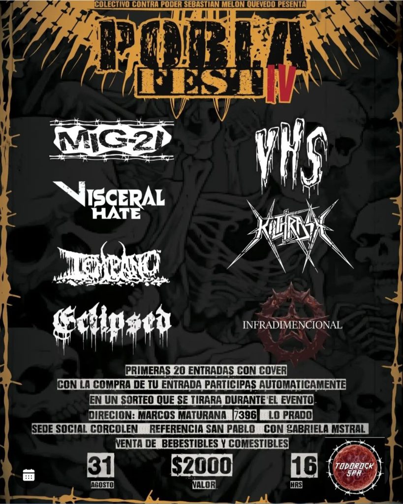 Este sábado 31 agosto tenemos el agrado de estar nuevamente apoyando la gestion independiente del metal nacional en la sede social de lo rado junto a las bandas VISCERAL HATE, MIG-21, VHS, KILTHRASH, TEMPANO, ECIPSED e INFRADIMENCIONAL desde las 16hrs.adhesion $2.000. Colabora www.todorock.cl