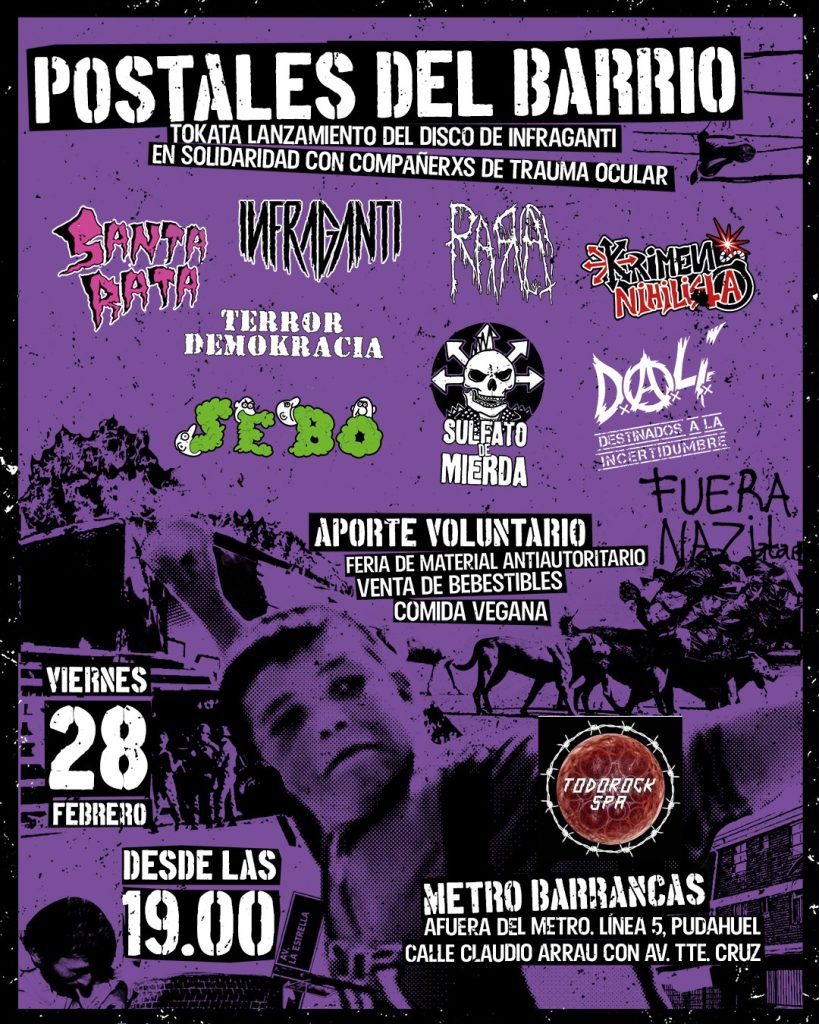 Este sabado 28 febrero desde las 19hrs. tenemos el agrado de colaborar con esta actividad solidaria a beneficio de las victimas de trauma ocular y que ademas coincide con el lanzamiento de la banda INFRAGANTI. Invitados: SANTA RATA, INFRAGANTI, RARA, TERROR DEMOCRACIA, SULFATO DE MIERDA y SEBO. Lugar al aire libre gratis metro barrancas, (arrau con tte. Cruz.) Colabora www.todorock.cl