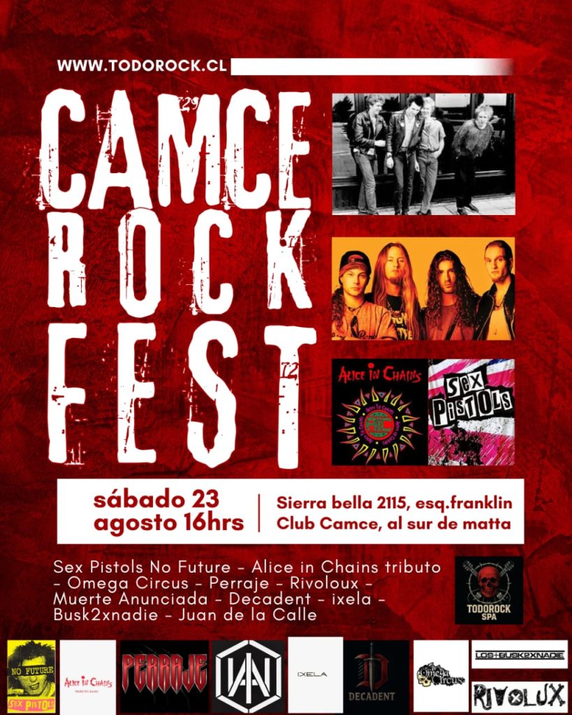 Previa a sex pistols chile 2025 en club camce, sierra bella 2115 ESTE SABADO 23 AGOSTO desde las 16hrs. junto a NO FUTURE(SEX PISTOLS), TRIBUTO ALICE IN CHAINS, PERRAJE, MUERTE ANUNCIADA, OMEGA CIRCUS, DECADENT, RIVOLOUX, BUSK2XNADIE(duo), IXELA(SOLISTA) y JUAN DE LA CALLE(solista).preventa $2000 ticket.todorock.cl invita www.todorock.cl