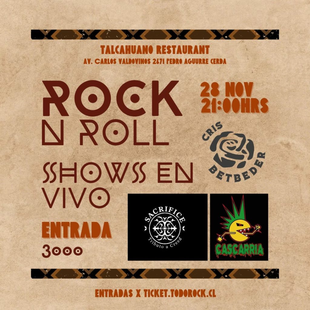 (sacrifice) + cascaria + cris betbeder en vivo desde las 21hrs. Av. Carlos valdovinos 2671, pedro aguirre cerda. Valor puerta $3.000. Pregenta $2000 en ticket.todorock.cl. invita www.todorock.cl & talcahuano restaurant
