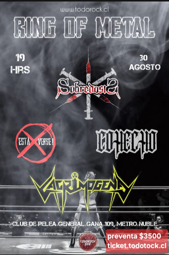 Este viernes 30 agosto tenemos el agrado de volver al cuadrilátero de matta sur junto a sobredosis + esta x verse + lacrimogena + cohecho desde las 19hrs. Invita www.todorock.cl y santiago fight club.