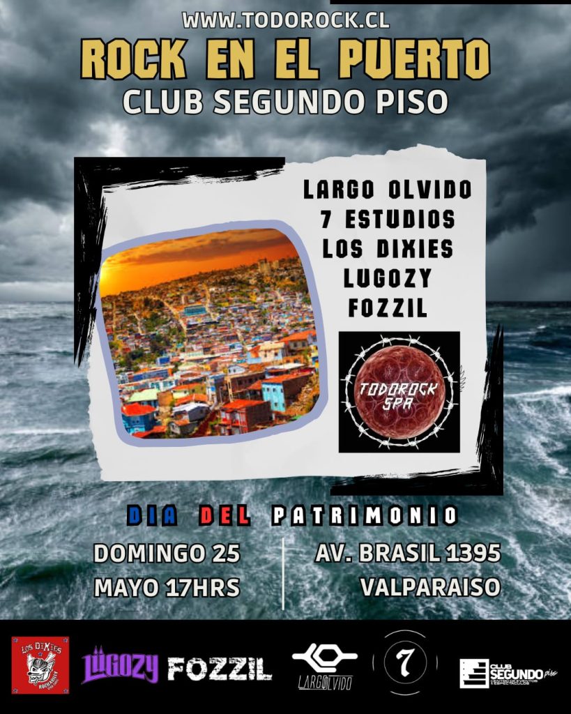 Tenemos el agrado de expandir nuestro circuito de bandas emergentes hacia Valparaíso, club segundo piso, con el estreno el domingo 25 mayo, que ademas coincide con el DIA DEL PATRIMONIO CHILENO. en esta jornada nos acompañan las bandas originales LUGOZY, LARGO OLVIDO, LOS DIXIES, 7 ESTUDIOS y FOZZIL desde las 17hrs en AV. BRASIL 1395, VALPARAISO, VALPARAISO. APORTE VOLUNTARIO $2.000 EN TICKET.TODOROCK.CL . invita, organiza y produce www.todorock.cl y club segundo piso.