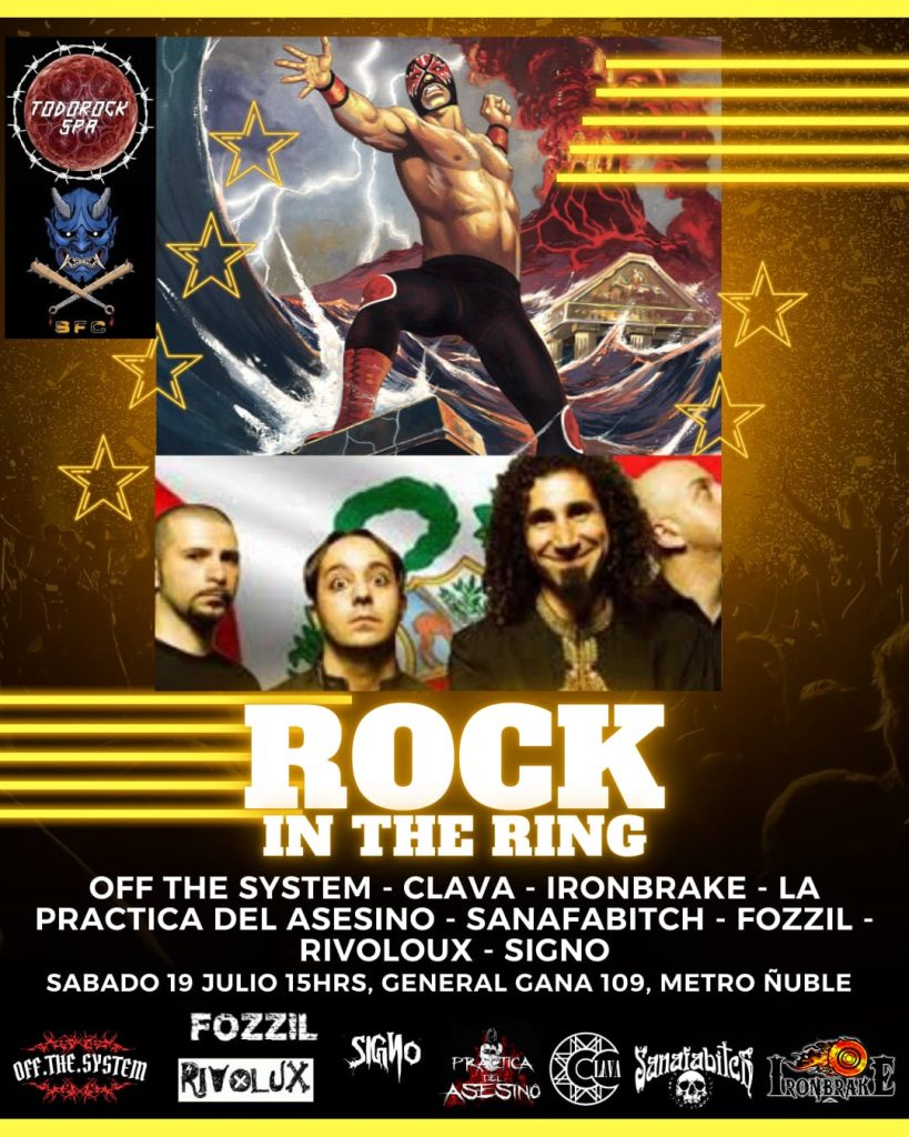Ciclo ROCK IN THE RING vuelve al SANTIAGO FIGHT CLUB el sabado 19 julio desde las 15hrs. Junto a OFF THE SYSTEM(system of a down), FOZZIL, CLAVA, LA PRACTICA DEL ASESINO, SANAFABITCH, IRONBRAKE y RIVOLOUX. PUERTA $4.000 PREVENTA $2500 TICKET.TODOROCK.CL.