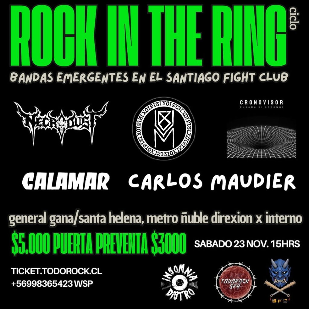 Rock in the ring sabado 23 noviembre santiago fight club desde las 15hrs. junto a las bandas originales: CALAMAR, NECRODUST, UNA BANDA MAS, CRONOVISOR y CARLOS MAUDIER. Direchion x interno. Preventa 3mil ticket.todorock.cl. invita,produce y colabora www.todorock.cl 25 años desde el under para el under.
