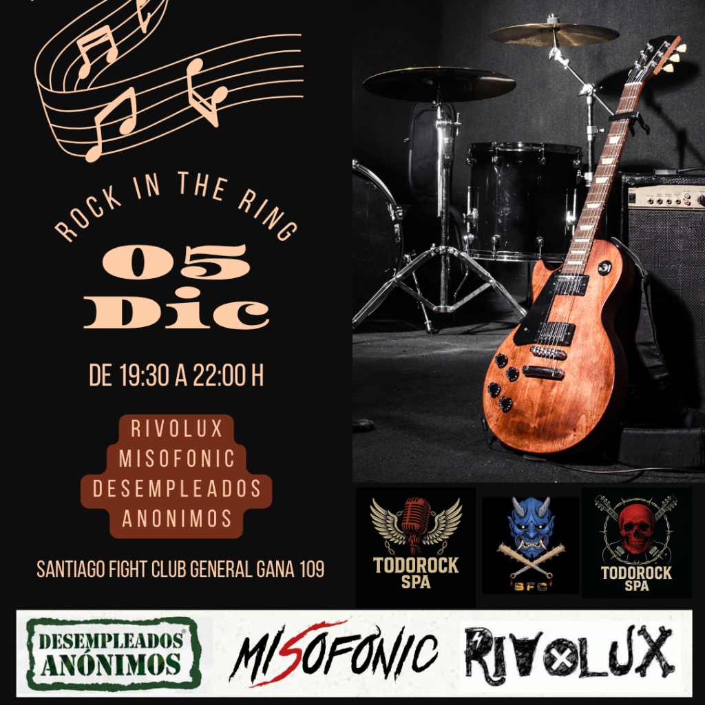 Este viernes 5 diciembre santiago fight club & www.todorock.cl presentan “ciclo rock in the ring” de 19:30 – 22:00hrs. Junto a los grupos RIVOLOUX, MISOFONIC y DESEMPLEADOS ANONIMOS adentro del cuadrilatero. cocina y barra popular + estacionamiento gratis. Invita www.todorock.cl