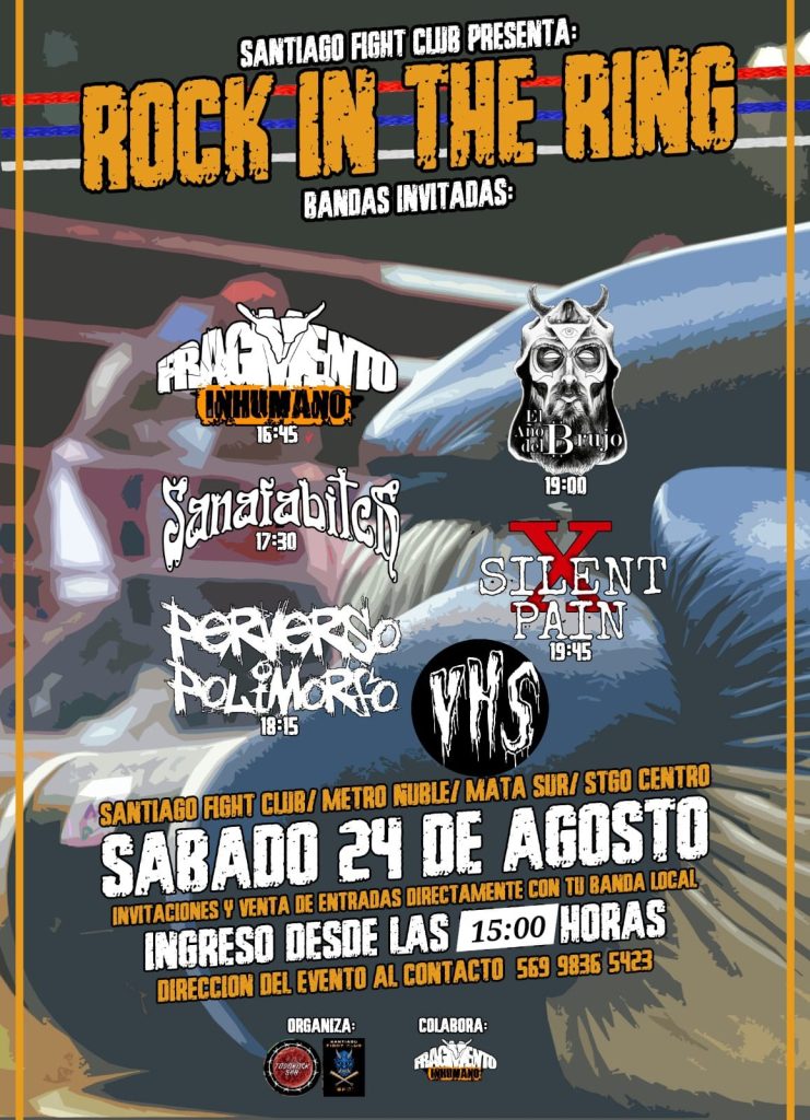 Este sabado 24 agosto continua el ciclo rock in the ring en el santiago fight club de metro ñuble desde las 15hrs junto a los nacionales: VHS, FRAGMENTO INHUMANO, EL AÑO DEL BRUJO, PERVERSO POLIMORFO, SILENT PAIN Y SANAFABITCH. Invita Www.todorock.cl y stgo fight club