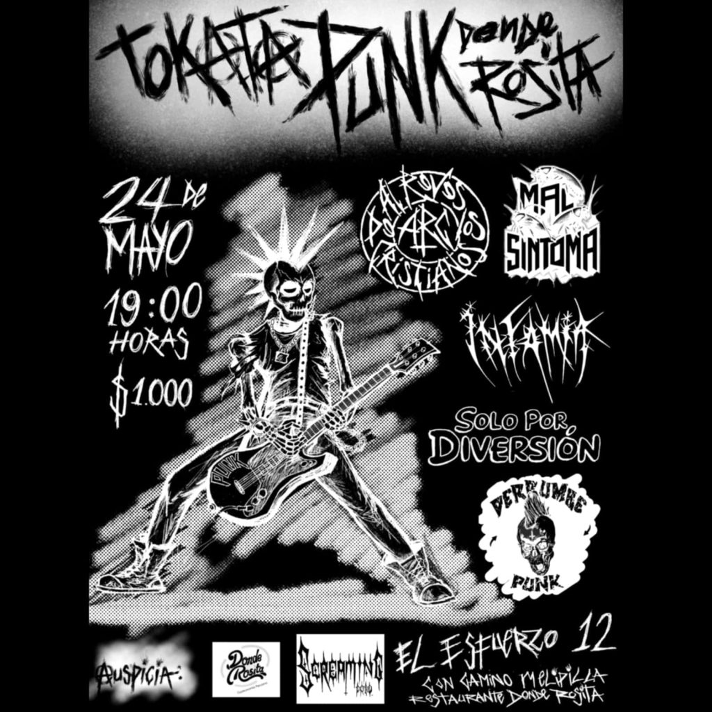 Estaremos de regreso en la comuna de padre hurtado este sabado 24 mayo en el restaurant donde rosita desde las 19hrs junto a las bandas: INFAMIA, AL REVES LOS CRISTIANOS, DERRUMBE PUNK, MAL SINTOMA y SOLO POR DIVERSION. Adhesion $1.000. Restaurant donde rosita El Esfuerzo 12 (esquina Camino A Melipilla). Colabora y transduce www.todorock.cl