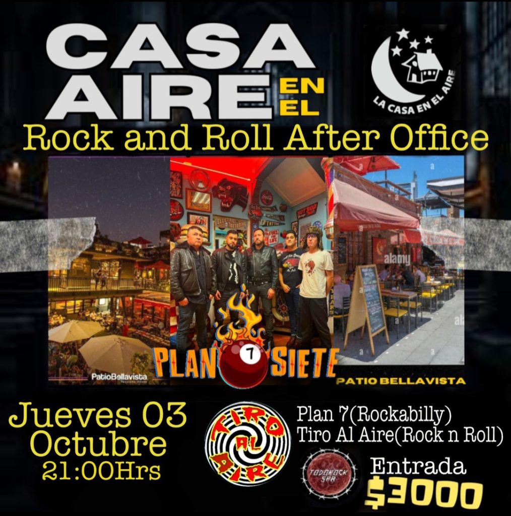 Este jueves 3 octubre continua el mini ciclo en la CASA EN EL AIRE del PATIO BELLAVISTA junto a PLAN 7 y TIRO AL AIRE desde las 21hrs. Adhesion $3.000 colabora www.todorock.cl