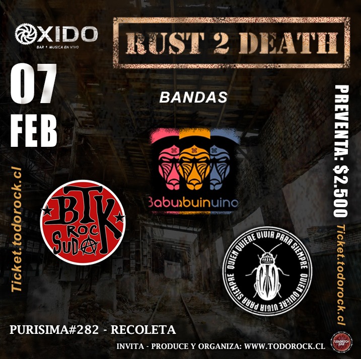 Este viernes 7 febrero vuelve el ciclo “rust 2 death” de www.todorock.cl desde las 21hrs. en el renovado bar oxido de purisima 282, recoleta junto a las bandas: