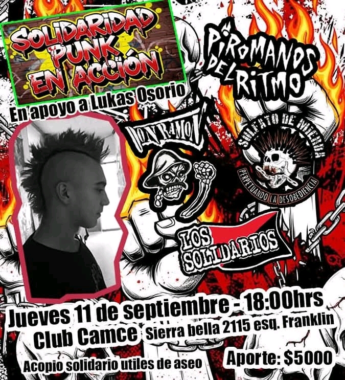 Evento a beneficio de lucas Osorio jueves 11 septiembre 18hrs. Club camce de sierra bella 2115, franklin. Bandas en vivo DON RAMON, PIROMANOS DEL RITMO, LOS SOLIDARIOS y SULFATO DE MIERDA. Aporte $5.000. Acopio de articulos de aseo y de higiene personal. Organiza Selloautonomo, colabora www.todorock.cl