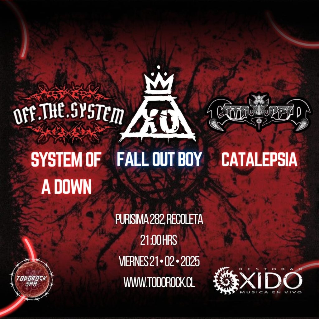 Este viernes 21 febrero desde las 21hrs en el bar oxido de bellavista se presentan las bandas SYSTEM OF A DOWN(TRIBUTA OFF THE SYSTEM, FALL OUT BOY( TRIBUTA XO) Y CATALEPSIA(METAL). ADHESION PREVENTA $2500 EN TICKET.TODOROCK.CL. INVITA, PRODUCE Y ORGANIZA WWW.TODOROCK.CL