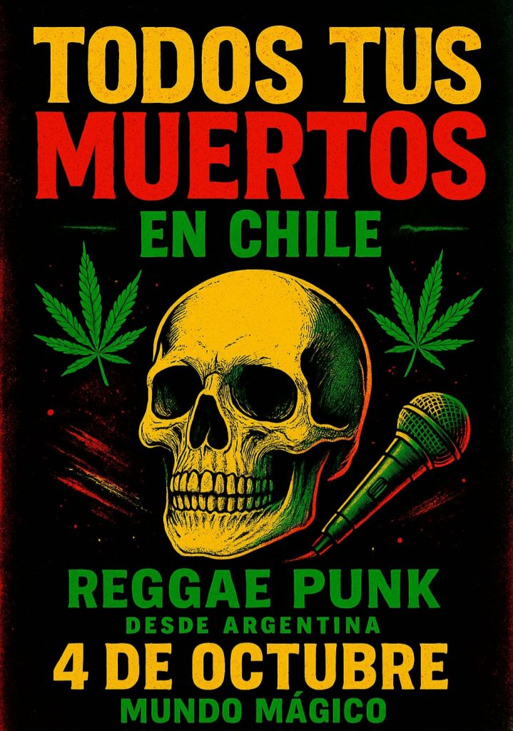 Quieridos amigos tengo el agrado de anunciar la llegada a Chile de la legendaria banda Argentina “TODOS TUS MUERTOS” en un show único y exclusivo para el dia Sabado 4 Octubre en el ex MUNDO MÁGICO( Lo Prado) desde las 16hrs. y con motivo a su decimo cuarto natalicio en una histórica e intensa jornada multicultural. asegura tu preventa pronto.