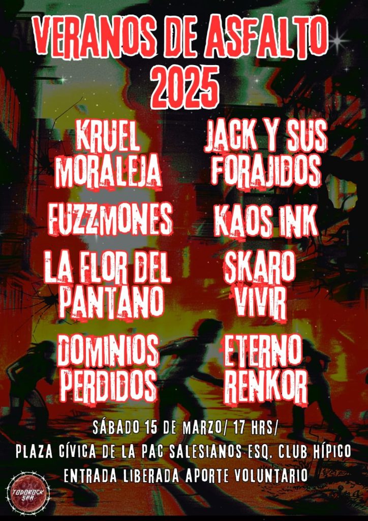 Festival veranos de asfalto 2025 sabado 15 marzo al aire libre en la plaza civica de pedro aguirre cerda(salesianos con club hipico) desde las 17hrs. Bandas en vivo: FUZZMONES, KRUEL MORALEJA, JACK & SUS FORAJIDOS, KAOS INK, LA FLOR DEL PANTANO, SKARO VIVIR, DOMINIOS PERDIDOS y ETERNO RENCOR. aporte voluntario. Colabora www.todorock.cl